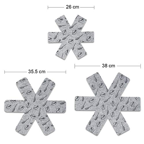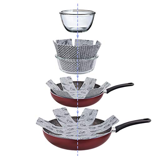 【BESCHERMING TEGEN KRASSEN】: Bescherm uw keukengerei tegen alle soorten krassen en stoten met deze praktische en gebruiksvriendelijke panverdelers. Plaats ze er gewoon tussen en vermijd scheuren en stoten!