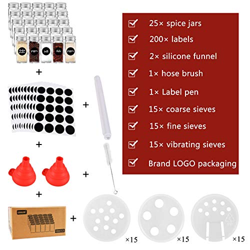 Hoogwaardig materiaal. Omdat de opbergpotten klein en moeilijk schoon te maken zijn, is een reinigingsborstel inbegrepen om het gemakkelijk schoon te maken, De glazen potten voor eenvoudige identificatie, we leverden twee pakketten van specerijenpotlabels, De metselaarpotten met drie verschillende maten zeef, zeer geschikt voor verschillende specerijen van verschillende grootte, waardoor u een perfecte ervaring hebt