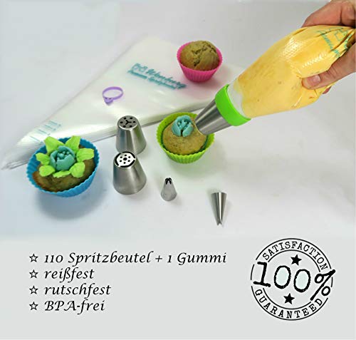 🎈 110 wegwerpspuitzakken in optimale afmetingen (30 cm) voor taart-, cupcake, taarten en muffindecoratie of voor het bewaren van levensmiddelresten (bijv. aardappelzetmeel, rijst). Extra 1 rubber voor het verwijderen van de spuitzak